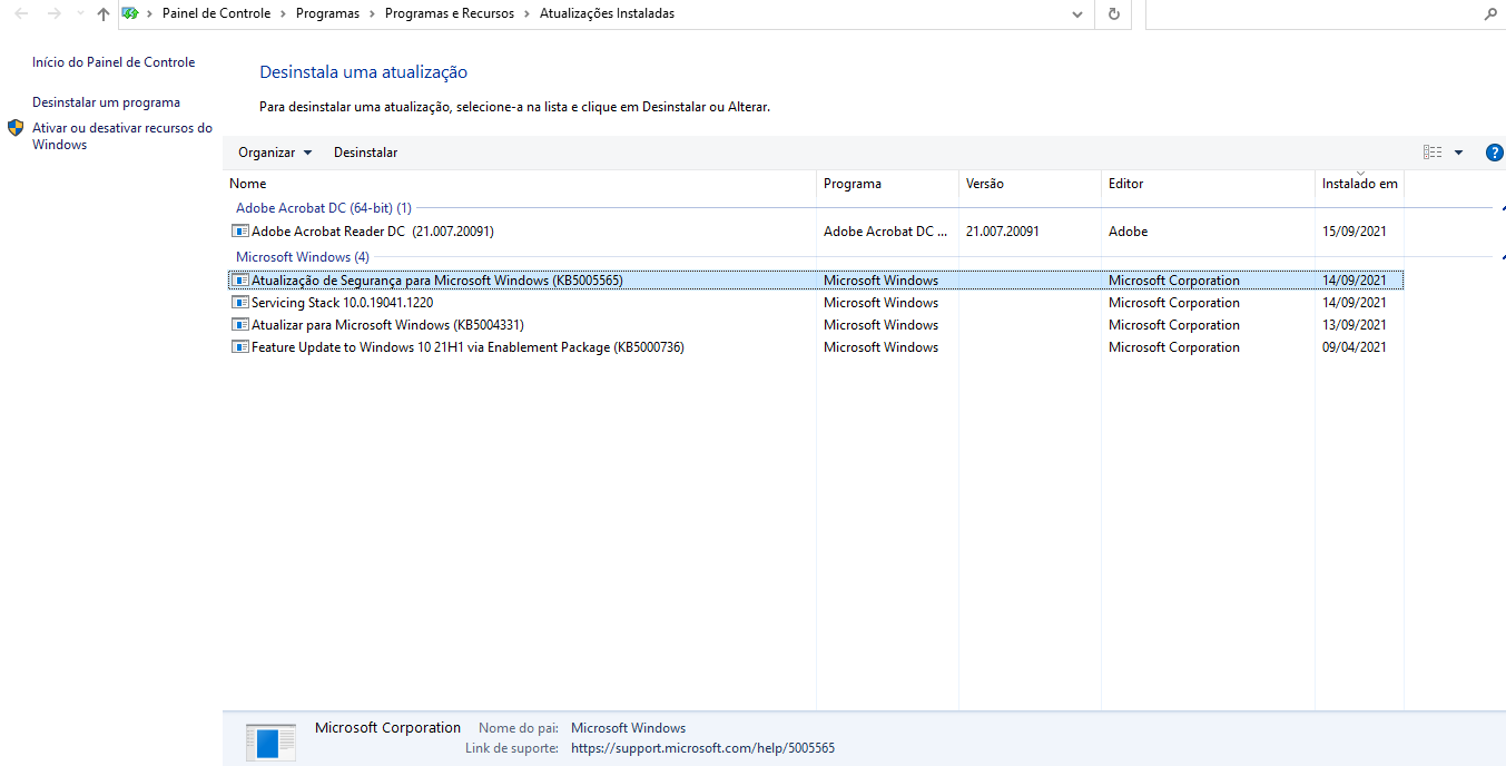 3 - Clique sobre a atualização KB5005565 e realize a desinstalação, caso o computador não reinicie automaticamente, realize a reinicialização.